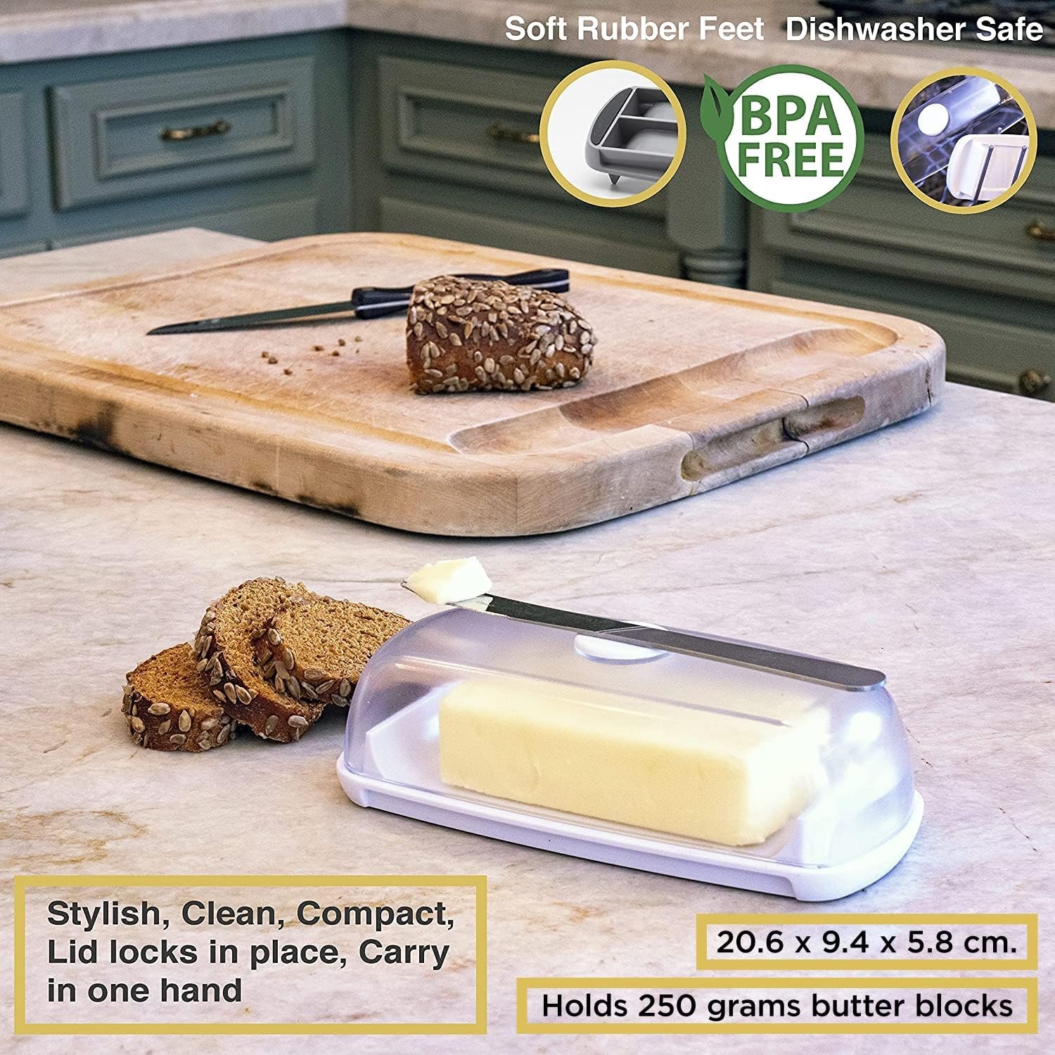 NO MESS DESIGN – No more butter rings on the counter; Feet extend below the bottom of the lid so any butter mess on the rim is kept off the table; A typical butter dish with cover has a flat lid rim that leaves a ring of butter everywhere you set it down; Butter Hub s extended plastic feet keep your counter clean; The lid s feet also lock into the tray so the lid doesn t slide around when carried.